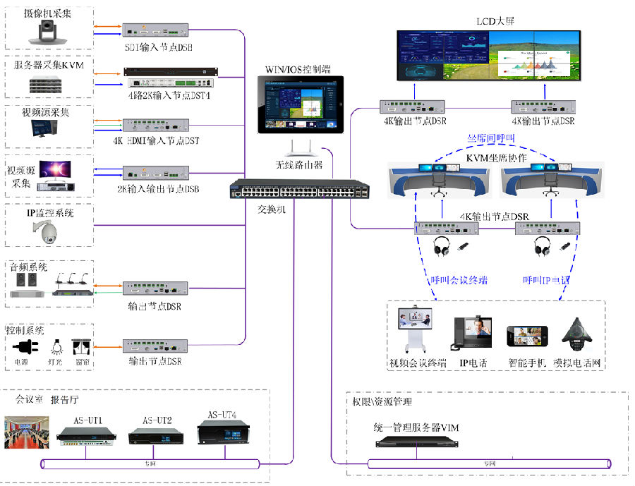 3、 会议室,报告厅,VIP室采用XKTY星空科技音频、视频、控制、录播、视频会议、多方交互MCU六大功能于一体的综合一体AS-UT主机,便于部署、便于实施、便于维护。