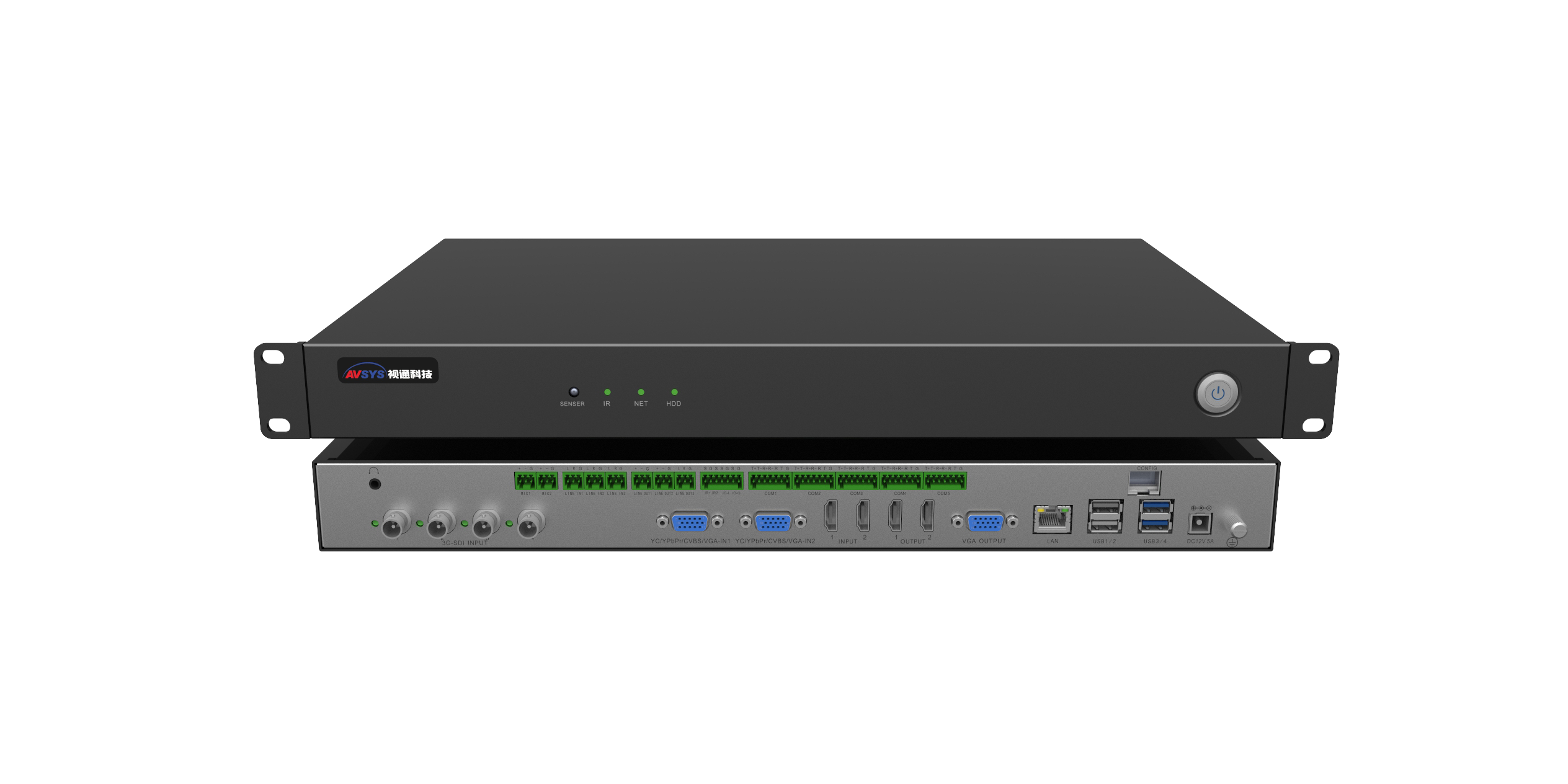 主机以ALL-IN-ONE的设计理念,集AVCRTM六合一:将音频处理器A、视频无缝混矩V、可编程中控C、录播编解码R、视频会议终端T、多方互动MCU综合于一体